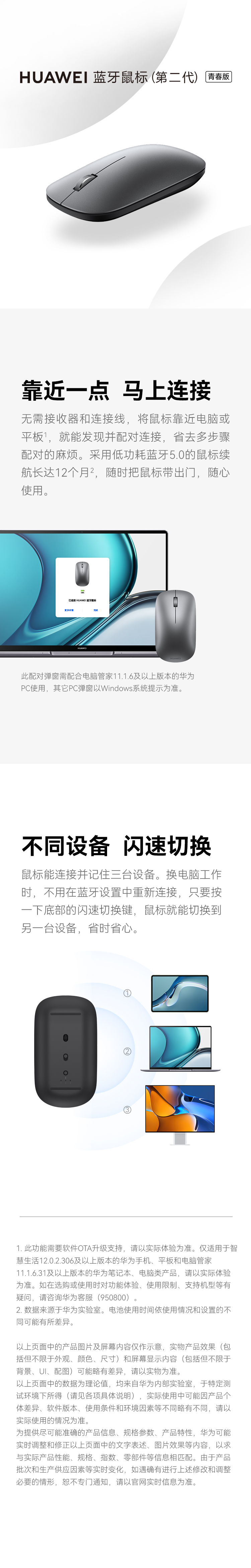 商品名称:华为蓝牙鼠标(第二代)青春版 无线鼠标 台式机笔记本鼠标 适配MateBook全系笔记本电脑 灰色