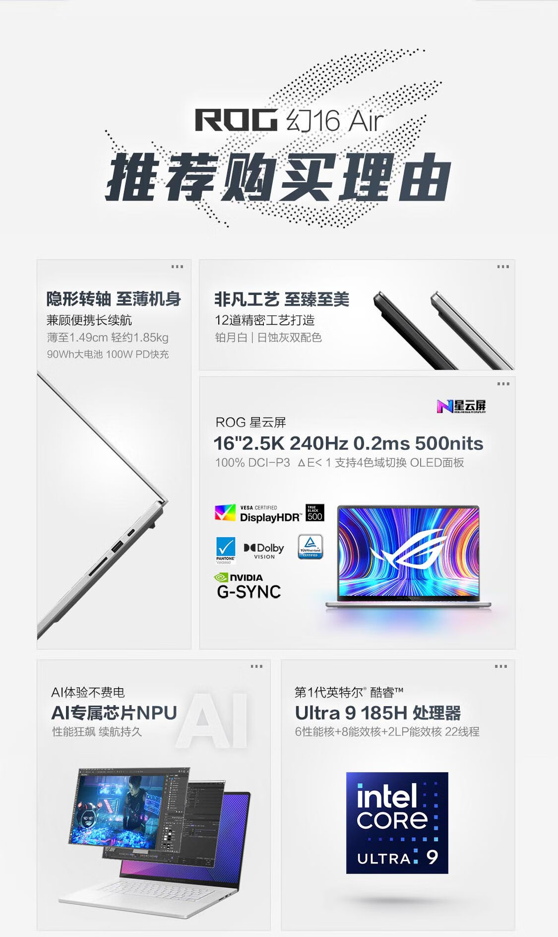 商品名称:ROG幻16 Air 酷睿Ultra 9 16英寸设计师游戏本笔记本电脑(U9-185H 32G 1T RTX4060 2.5K 240Hz)日蚀灰