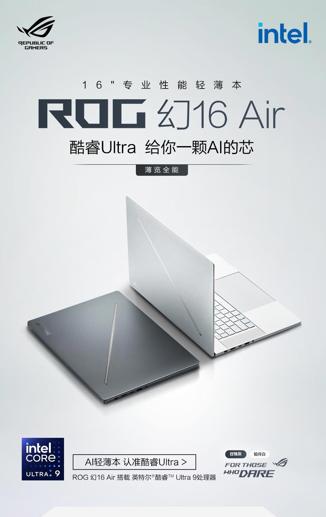ROG幻16 Air 酷睿Ultra 9 16英寸设计师游戏本笔记本电脑(U9-185H 32G 1T RTX4060 2.5K 240Hz)日蚀灰